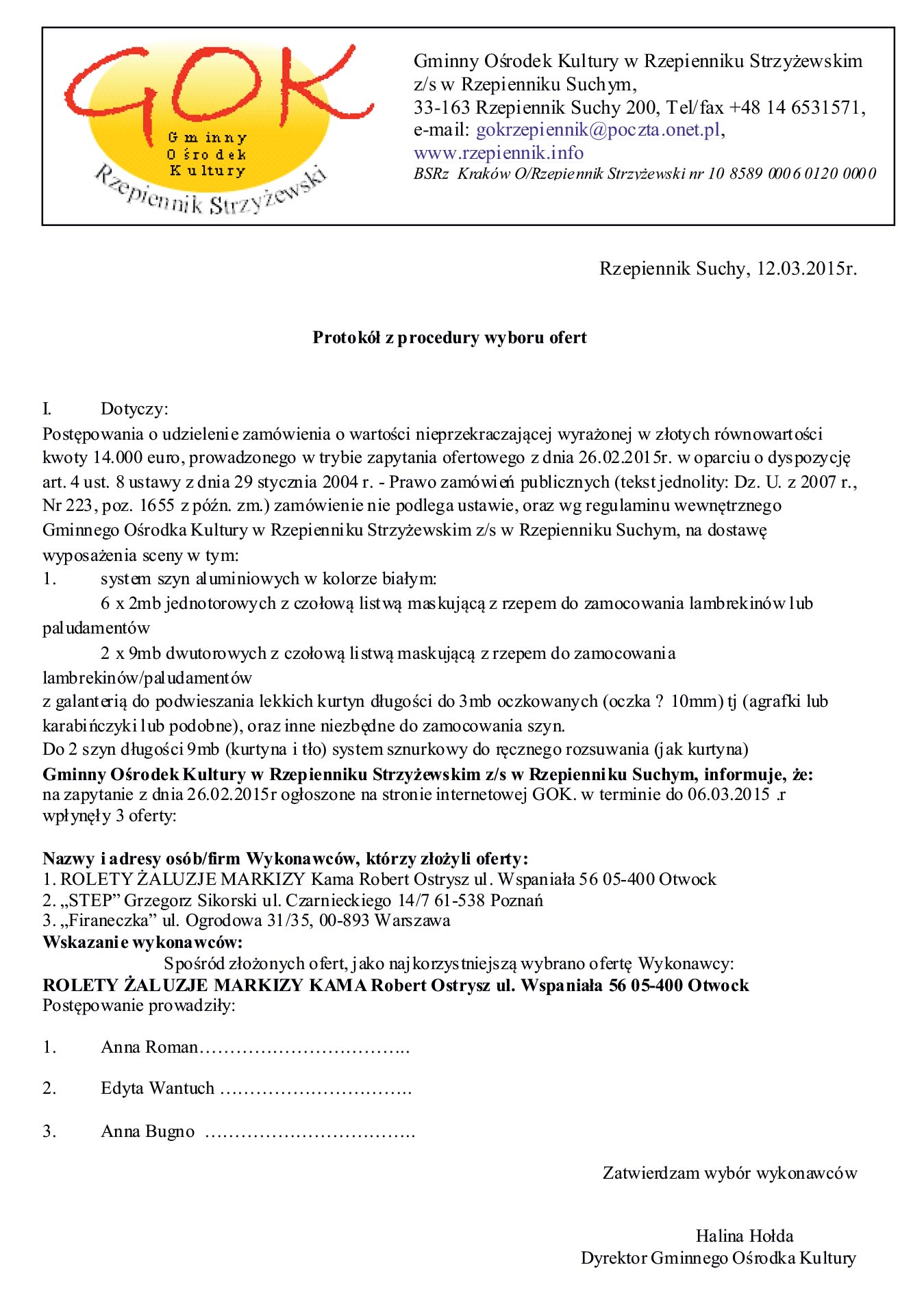 Poniżej publikujemy protokół dotyczący wyboru oferty na wyposażenie sceny GOK w Rzepienniku Suchym w system szyn. Dziękujemy wszystkim za złożone oferty.